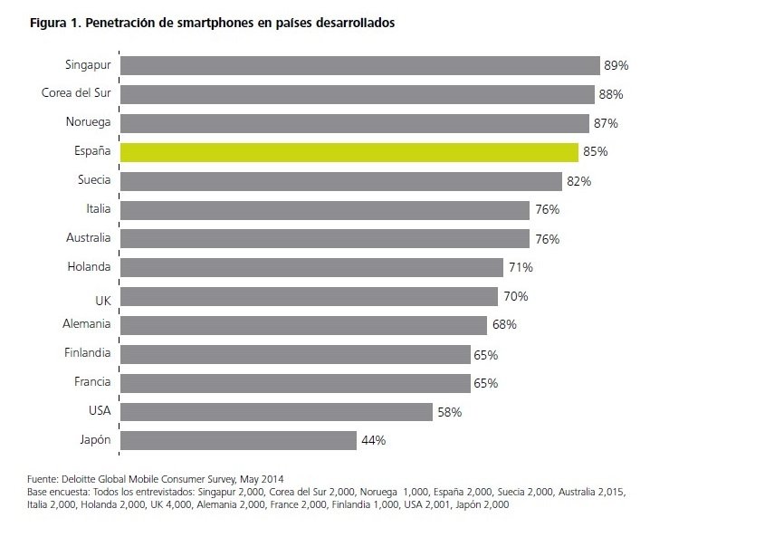 España se situó el 2014 como el cuarto país dónde mayor ha sido la penetración del uso de los Smartphones (85%), por detrás de Singapur, Corea del Sur y Noruega, según el estudio Consumo móvil en España: Revolución y evolución de Deloitte.