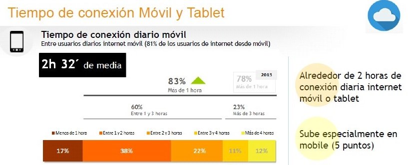Según el VI estudio Anual Mobile Marketing del Interactive Advertising Bureau (2014) estamos de media alrededor de 2h y 32 minutos diarios conectados con nuestro Smartphone.